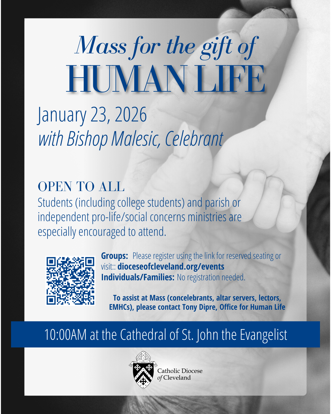 The 2026 Catholic Diocese of Cleveland will celebrate "Mass For Giving Thanks to God for the Gift of Human Life” (no. 48/1 of the Masses and Prayers for Various Needs and Occasions) on Friday, January 23rd, 2026. Bishop Edward C. Malesic will be the main celebrant.